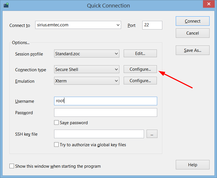 To do this, click 'Configure' where you select Secure Shell as your connection method